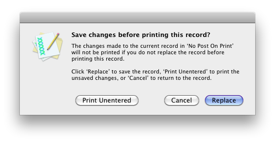 The issue has often been raised: when a record is edited but not entered (or replaced) and the user prints the form, what should happen? Should Helix print the stored record even though it does not match what is on screen, or should it print what is on screen even though the user may later choose to discard the changes? Should the modified data be discarded, or automatically stored? If the view uses Print Posting features, which values should be used to calculate the posting: the stored values or the typed-but-not-yet-entered values? The new specification clarifies all of these situations, resulting in a consistent behavior that offers the user additional options when printing unentered records. It also offers collection designers a clear specification to work with when creating Helix-based applications. This technote details the new specification and documents the changes which debuted in Helix 6.1.6; Users of older versions of Helix should consult the legacy version of this technote to understand the behavior in prior versions. Helix has always had the ability to print unentered record data (just as any other program can print an unsaved document), but Helix’s Print Posting option adds a wrinkle that creates a serious data integrity issue: How can you post based on data present on the form when that data can be discarded after printing? |