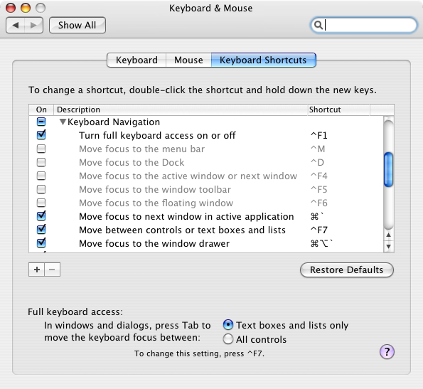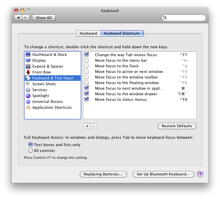The pictures on the right (click to zoom) show the Keyboard Shortcuts panel in the Keyboard section of System Preferences for OS X 10.4–10.6. You get to this panel by…