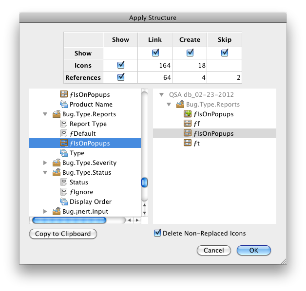 If no icons are found that satisfy a rule, the next rule is checked. When one (and only one) icon is found that satisfies a rule, the search stops. If multiple icons that satisfy a rule are found, the next rule is consulted as a ‘tie breaker.’ The final arbiter of all conflicts is the internal Object ID. Users familiar with the AppleScript implementation in Helix will understand and can examine the internal Object ID of icons and other structural elements of a collection. Once a match has been found, it is ‘type checked’ to confirm that the replacement is logical. For example, a template can not replace a post, even if both the Name and Object ID are exact matches. Likewise, a field (or abacus) can not replace a field whose datatype or inert status has changed. Therefore, if an abacus’ output has been changed from, for example, number to fixed point, it can not be used to replace the existing (number type) abacus of the same Name/ID. In this case, you must create a new icon for the new datatype. If the changes being applied cover all references to that icon, the original will be left unused, and can be deleted after the fact, or by checking the Delete Unused Icons checkbox. Icons that are part of the incoming structure must either replace an existing icon or create a new one. They can not be skipped, a fact that is subtly indicated by blank cell in the grid, rather than a 0. It is not-so-subtly indicated by the fact that the linkage simply won’t deselect. References that can not be linked to existing icons are, by default, not created, and appear in the Skip column. The user has the option to create a ‘placeholder’ icon as a stand-in, which moves that icon into the Create column (as a reference). References that are matched can be unlinked, leaving icons that refer to it incomplete. (See notes on references above.) Source icons only match to pre-selected target icons; source references match to any target icons, regardless of selection. |