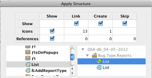 Each column (Link, Create, Skip) is combined with the two rows (Icons, References) to form a matrix of possible actions when the structure is applied. The effect on the target collection for each of these combinations is shown in this table: