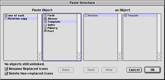 When structure is applied to a collection — by choosing a clipping from the ‘©’ menu or selecting ‘Paste’ from the ‘Edit’ menu when there is structure on the clipboard — a dialog allows you to control the process. This dialog gives the user control of each icon being applied to the collection. In particular, you can determine whether an incoming icon should create a new icon or replace an existing one. The components of the dialog (shown at right) are: