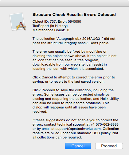 A picture pasted into a rectangle could have incorrect length data, causing Helix Utility’s “Compress Collection” command to fail. This could be the result of a bug in one or more of the Helix 6.2 Preliminary Releases, or could be the result of other influences (cosmic rays, etc.).