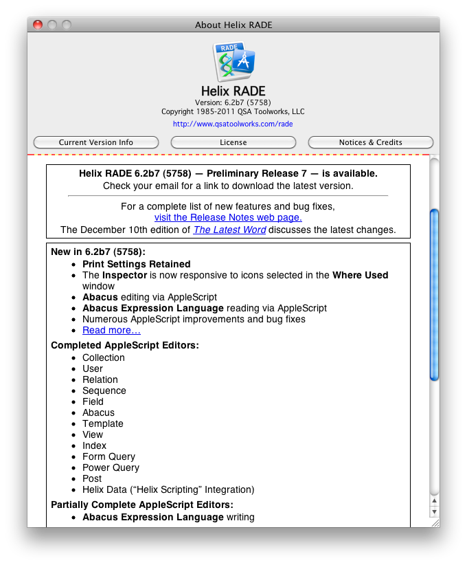 For those of you who have already climbed aboard the Europa Pioneer plan, your monthly $20* charge will appear on your credit card today. For those out there among “the rest of you,” remember that if you’re thinking of joining the Pioneer program this month, the initial payment is now $140. After all, you are getting “$140 worth of improvements” right from the start. All subsequent monthly payments will be $20. As previously noted, when your credit card is successfully charged, we send you an email. In that email will be a link to the newest installer. Click that link to download the lastest update to your computer. (You can also get it by logging in to our web store and checking your current licenses.) Once you have downloaded the installer disk image, the installation process is simple: If this is your first experience with Europa — or you like to manage your updates manually — just drag the new Helix RADE onto the Applications folder and let go. If you are updating from an earlier version of Europa, double click the Install Update icon and your Europa RADE will be seamlessly updated to the new version, even if you have a collection open! (You will be prompted to save changes before closing an open collection.) This month’s release brings us almost to the end of the AppleScript project. There’s one small but powerful new feature to be completed, but it was just beyond our reach for this month. In addition, this release brings back something Helix users have sorely missed for nearly five years! As happened a month ago, this edition of The Latest Word may veer off the purely precise course a bit, so to get the specifics on the various new features in both AppleScript and the graphical user interface, as well as the various fixes that can be found in this release, be sure to read the release notes. For now, let’s see where we stand with the release of PR7 and how best to benefit from the progress we have just made. Sound RestoredMost of the “seminal moments” in the recent history of Helix have, unfortunately, been the result of storms that have blown our way and forced us to shift our priorities. While we have succeeded in getting through nearly all of these blizzards, the one seminal moment that continues to elude our grasp has totally dominated our thinking for so long that it is difficult to imagine life without it, and yet that life will soon be upon us: Helix without Classic. Once we had Helix Server, Client and Engine and our diagnostic duo, Helix Utility and Update Collection, all running in macOS, we had a way to keep the heart of Helix beating while we cleared the way to its soul: Design Mode. There’s a scene in almost every crime drama in the movies and on television, when one spouse goes to visit another in jail. They sit down, face to face, with a steel reinforced window between them and pick up their telephones. In the Helix version of this scene, the phones are out of order. All we can do is try to communicate with gestures and hope ‘the powers that be’ get the phones working again. In the Helix version of this scene, the prison is Helix without graphic Design Mode editors. The phones represent a complete AppleScript implementation; the sign language the partial scripting we’ve had so far. From the beginning of this incarceration, we could see our imprisoned collections in macOS, but we could not change their designs, at least not until we threw in our lot with AppleScript. At first — way, way back in the summer of this very year — AppleScript allowed us to change collections a little. It was a bit awkward at first, but it worked. A smile or wink through the reinforced glass and our collections were reassured of our devotion. But with each month that went by, we learned more new gestures and we found we could communicate better with every visit. Prior to this month, the only part of the soul of Helix that we could not reach with AppleScript was the abacus. Like so many obstacles that have stood in our way, this one is now gone. There is now no facet of collection design that can not be examined and modified with scripting. As a famous man once (almost) said, “My fellow Helix users, our long nightmare is over.” There’s a reason we left the abacus for last. Of all of the structures in a Helix collection, it is the most complex. As we started working through the scripting of the abacus, it became clear that, compared to the rest of the icons, working with an abacus in AppleScript would be a real head-scratcher. Knowing how difficult ‘scripting an abacus’ would be, we sought, and found, a solution. In seven months, the AppleScript project has gone from a glimmer in the eye to a completely new way to look at Helix. Along the way, we were able to implement two key technologies: The first we called ‘AppleScript Nirvana’, which, to the uninitiated simply makes working in AppleScript much less tedious, much more direct. The second is the powerful new feature we are introducing today: the Abacus Expression Language. Earlier, we mentioned that there was a ‘small but powerful’ piece still not in place. It is this piece that will tie the AppleScript project up neatly and completely. From the Petroglyph to the Written WordThey say that a picture is worth a thousand words, but sometimes words are simply more efficient. Did you ever find yourself sitting at a table with a napkin and a pen trying to work out how you might build an abacus? Maybe you draw the actual tiles, with arrows into their black holes. Perhaps you write it out in some linear fashion, some shorthand you evolved for that purpose. Maybe it looked like this: IF ( [Last Name] starts with [N] ) THEN [1] ELSE [0] That simple bit of text was enough for you to know what to do when you got back to your computer. But wouldn’t it be great if you could just feed that thought into Helix and have the abacus created for you? That, in essence, is what the Abacus Expression Language 