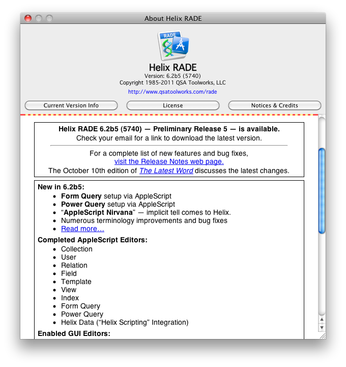 For those of you who have already climbed aboard the Europa Pioneer plan, your monthly $20* charge will appear on your credit card today. For those out there among “the rest of you,” remember that if you’re thinking of joining the Pioneer program this month, your initial payment is $100. After all, you are getting “$100 worth of improvements” right from the start. All subsequent monthly payments will be $20. This month’s release continues to enhance RADE’s AppleScript capabilities, adding more key pieces of the puzzle. The finish line for this phase is clearly in sight! Sadly, we’ve had a few people drop out of the Europa Pioneer Plan. This created a small conundrum for us, as we had made the update process a simple matter of opening the About Helix RADE window (in the Helix RADE menu) and clicking on the download link. The new process is almost as easy: when your credit card is successfully charged, we send you an email. In that email will be a link to the newest installer. Click that link to download the lastest RADE to your computer. Once you’ve got the installer, the process remains the same: If this is your first experience with Europa — or you like to manage your updates manually — just drag the new Helix RADE onto the Applications folder and let go. If you are updating from an earlier version of Europa, double click the new Install Update icon on the disk image. Your Europa RADE will be seamlessly updated to the new version, even if you have a collection open! (You will be prompted to save changes before closing an open collection.) What can the new Helix RADE — Europa — do today?For starters, it runs. In fact, it runs so well you can… well, let us not get ahead of ourselves. It self-diagnoses. If you are a Europa Pioneer and have been running Helix RADE 6.2 builds on an Intel-based Macintosh, you have already experienced the benefit of having Helix automatically run the structure check for you, performing routine maintenance as necessary. Now we know, of course, that some of you are completely nonplussed by this, but if you don’t appreciate it, just consider that in the long run, routinely maintained Helix collections will have fewer problems and will make for happier customers. That’s you. The days of working for hours only to discover that a bit of structural damage has crept in during the process are over. Now, if you attempted to use the first Europa releases on a PowerPC Mac, you probably did not have much luck doing anything with all but your smallest collections, because the integrated structure check appeared to hang up, when in reality it was running… very slowly. This was due in part to the fact that the integrated structure checker was cleaning up anomalies and obsolete structure that had previously gone undetected. We’ve literally seen hundreds of thousands of these little bits of uselessness in some old collections! In order to keep the PowerPC users going, our last release gave you a way to turn the integrated structure check off, so you could work — and save your work — at last. But when you turn the integrated structure checker off, you have to remember to run your collections through the old Update Collection 6.0 application to check the structure. If you are serious about Helix and you work with large collections, you probably already have an Intel Mac. If you haven’t already done so, open your production collections with the latest Europa on an Intel Mac and clean that stuff up. If you don’t have an Intel Mac yet, maybe it’s time. But we digress. With the ability for PowerPC Mac users to bypass the integrated structure check, they have been able to do virtually everything else the Intel-based Mac user can. But that may be the last nod we make to the PowerPC Macs. We are no longer intentionally funneling any resources into making things work better on PowerPC Macs, which were last manufactured in late 2005. But we are being careful to continue to write Universal code that runs on both Intel and PowerPC Macs, mainly because there is no extra effort involved. We are soon going to conclude the AppleScript implementation phase of Europa, and we will then turn our attention back to the GUI. We have some ideas about how to do that most efficiently, but some of them may require extra effort for the PowerPC. If that becomes evident, those functions will simply be disabled on PowerPC Macs. The future (and present, really) is on Intel. Just a few short months ago, using Preliminary Release 1 of Helix RADE 6.2, you could open and run a copy of your Helix collection in User Mode, just as you could do in Helix Engine, and for the first time in macOS, you could go into Design Mode and have a look around. But that was about all you could do. And back then, even though the User Mode part of RADE was ostensibly the same as what you see in Helix Engine 6.1, it was not yet as stable. What can you do with Europa?Up above, we wrote that Europa “runs so well that you can…” and then we left you hanging. Let’s finish that sentence: Europa runs so well that you can now, starting with Preliminary Release 5, officially work in User Mode for daily tasks. If you are using Helix Engine to use your Helix collections in User Mode in macOS, feel free to switch over to Helix RADE 6.2b5 without fear of damage. Should something completely unexpected happen and you do encounter damage, we’ll do the repair for free, unless the evidence points to something else (like a failing Hitachi hard drive) as the culprit. None of the foregoing, however, should be taken to imply that you are safe to run without making frequent backups of your work and checking both the structural and data integrity of your collections! With most of the icons now scriptable, you can actually pop in and out of Design Mode and accomplish things. All of the icon types can be created in the GUI, and you can use the macOS Inspector to edit the attributes of fields. The GUI also 