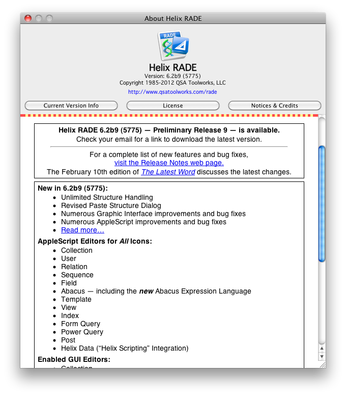 To those of you who signed up to the Europa Pioneer Plan via the monthly payment plan, your $20* charge appears on your credit card today, and earlier today you should have received an email containing a link to the newest installer. Click that link to download the lastest update to your computer. (You can also get it by logging in to our web store and checking your current licenses.) For those out there who haven’t joined us yet, remember that if you’re thinking of joining the monthly plan this month, the initial payment is now $180. The product you receive today benefits from the contributions of your fellow Helix users who have already joined. All subsequent monthly payments will be $20. But if you are thinking of joining up now, why not sign up for the annual subscription instead? For only $20 more, you’ll get every update through May 31, 2012. There should be three more releases between now and then, so it’s like getting two months worth for free. We also need to remind everybody who signed up for the Annual plan that the current plan runs through May 31, 2012, regardless of when you signed up. That $200 gets you “all of the progress made in the first year of the plan,” not “all of the progress made over the next year.” The installation process remains the same: mount the installer disk image, drag the new Helix RADE onto the Applications folder and let go. If you are updating from an earlier version of Europa, double click the Install Update icon and your Europa RADE will be seamlessly updated to the new version, even if you have a collection open! (You will be prompted to save changes before closing an open collection.) One last note regarding updates: if you are using the Interim Builds and would like to help us test an ‘automatic update’ process, contact Matt. He’s got something you might really like. As always, the complete notes regarding what’s new in this release are found in the Preliminary Release 9 Release Notes. For now, let’s take a giant leap into the enormous news touted above. So what was the big opportunity?Last month’s release bought us to the completion of the AppleScript project. At that time, we alluded to an opportunity that had come our way and that taking advantage of that opportunity might present somewhat of a detour from our path to resumption of work on the graphic interface of RADE for macOS. Of course, whether or not this opportunity really is a detour depends upon how you look at it, so herewith, the news and the spin (not necessarily in that order). Let’s start with the word RADE. RADE is an anagram for Rapid Application Development Environment. So at the core of Helix is the notion that using Helix will get you from point A to point B in less time, or more efficiently, or both. Adding AppleScript capabilities to Helix has already provided us with numerous new ways to speed up the development process, but that only begins to scratch the surface of what is possible. Last month we asked you to consider why we might want you to pay attention to the Paste Structure dialog and some fixes we had made there. Shortly after Thanksgiving, a discussion on the Helix List about the perils of copying and pasting structure was brought to our attention. The specific problem was about the limitation on the amount of structure that could be copied at once, a limit that dooms large pasting operations to failure. We were aware of this limitation, and we had already determined that fixing it, even making it possible to copy and paste entire collections in one step, was not only do-able, but doable in the relatively short time frame of about one month. We posted a message alluding to this, and hinted at a possible solution. However, in the continuous race to outrun our fate, we did not believe we had a month to spare. The AppleScript work was wrapping up and we would not delay the completion of that work for anything. But a scant month later, the AppleScript project was done and the outlook was new. Our plan was to immediately begin working on restoring graphic editing in Design Mode, but in the early moments of 2012, a user stepped up and volunteered to underwrite the project, saying, “I’ll write you a check right now if you guys can actually do that… I could actually get my nights and weekends back if this were possible (and bug free). I’m serious.” The enormous newsAnd he was. So he did. And so, after a bit of hand wringing — we really feel like we owe everybody waiting for the return of graphic editors some progress — and checking our bank balance, the decision was made, and off to work we went. And now, little more than a month later, the story can be told: With Helix RADE 6.2 Preview Release 9, available today, you can copy-and-paste an entire collection in a single step. Now you can, of course, still copy-and-paste in pieces, as you’ve been able to do for years and years. But the ability to copy-and-paste an entire collection adds a dimension to Helix that is at once powerful and liberating, not to mention simply astonishing. And it comes at a particularly propitious time because, as always, it takes money to keep this show on the road. But it was also good to have it done before we began working on the GUI, because once you get into that part of the code, you don’t want to come out until you’re done. So, far from being a detour, we prefer to see it as the next logical step in the evolution of Helix for macOS. With this new capability, you can take the structure of an entire collection full of data and paste it into a brand new empty collection, getting a completely empty copy of your collection in mere moments, without having to delete a single record. And if your collection has thousands, hundreds of thousands, even millions of records, this saves enormous amounts of time. Of course, this all works with clippings as well. If you want to see this new power in all its glory, open your largest collection, open the mai