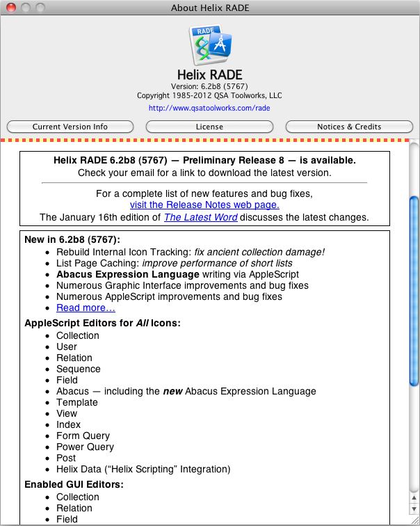 To those of you who signed up to the Europa Pioneer Plan via the monthly payment plan, your $20* charge appeared on your credit card on the 10th, and earlier today you should have received an email containing a link to the newest installer. Click that link to download the lastest update to your computer. (You can also get it by logging in to our web store and checking your current licenses.) For those out there who haven’t joined us yet, remember that if you’re thinking of joining the monthly plan this month, the initial payment is now $160. The product you receive today benefits from the contributions of your fellow Helix users who have already joined. All subsequent monthly payments will be $20. But if you are thinking of joining up now, why not sign up for the annual subscription instead? For only $40 more, you’ll get every update through May 31, 2012. There should be four more releases between now and then, so it’s like getting two months worth for free. We also need to remind everybody that signed up for the Annual plan that the current plan runs through May 31, 2012, regardless of when you signed up. That $200 gets you “all of the progress made in the first year of the plan,” not “all of the progress made over the next year.” The installation process remains the same: mount the installer disk image, drag the new Helix RADE onto the Applications folder and let go. If you are updating from an earlier version of Europa, double click the Install Update icon and your Europa RADE will be seamlessly updated to the new version, even if you have a collection open! (You will be prompted to save changes before closing an open collection.) As always, the complete notes regarding what’s new in this release are found in the Preliminary Release 8 Release Notes. Here we want to highlight some of the more important advances. AppleScript Project is CompleteThis month’s release brings us to the completion of the AppleScript project. Of course, there will be the inevitable bug fixes and minor improvements, but as the ‘About Helix RADE’ screenshot on the right shows, every Helix icon is now fully scriptable. There is now no Helix collection construction that can not be created using AppleScript. One can now, if sufficiently motivated, live without Classic, with no asterisk pointing to a footnote that says ‘except for …’ anything. We don't get to beat our chests that often. Getting the AppleScript project finished in eight months is one of those moments we need to savor. That we managed to complete this huge task in such a relatively short time is a testament to our Lead Engineer and Helix co-creator, Larry Atkin. Often working under less than optimal conditions (to put it mildly), it is Larry’s devotion to the cause of seeing Helix through this monumental transition that has made the rapid progress to this day possible. And ‘where we are’ is in fact a very good place. Along the way to a complete AppleScript interface to both User Mode and Design Mode, we’ve been making modest improvements to the graphic interface and fixing some very long-standing bugs, some of which should excite you even if using AppleScript is not part of your plans for Helix. We’ll get to those in a moment. But lest we give AppleScript short shrift today, let’s stop and celebrate the final pieces of the puzzle: The Abacus Expression Language (AEL) which was described in the December 10th The Latest Word is now write-enabled, so you can create any tile construction using a plain text ‘expression language.’ We’ve used this to create some very complex abaci, and it works great. For those of you who want to dig in to this new way of creating abaci, this technote contains the complete technical documentation that explains the language used to create an abacus expression. To show you how it works at a simple level, we’ve added a new Make A Constant script to the sample scripts page. This script does exactly what it says: it makes any abacus constant you want. Need a ‘true’ flag or ‘0’ fixed point constant? This simple script shows how simple it is. (Actually, the script is more complicated than that, because it lets you create any constant; the script Make True Constant on that page make a constant for ‘true’ in less than 10 lines.) Along with finishing that off, we wrapped up a few loose ends. We added more summarization flags to the abacus class, so you can now tell at a glance whether the abacus uses any of the tiles that can’t be indexed; improved the view code so that changes to the template no longer force the view to close and reopen; and made it so that changes to a user’s menu items while in User Mode now update the menus immediately. Deleting the UndeletableBack in the mid-twentieth century, man was at last hurtling into space. Only a few people could go, but everyone on earth could benefit from what was being learned on that frontier. In the Helix universe, that time is now. Things we have learned from working in macOS and AppleScript are now beginning to provide benefits for all Helix collections. Something that happened between PR7 and PR8 will illustrate. A major, long-standing problem in Helix has been fixed, thanks in no small part to Helix’s new AppleScript capabilities. But this is not just about AppleScript, so if you’ve had it up to here with all the AppleScript talk, this news is right up your alley. Often, when we are looking at customer collections to help them work through some thorny problem, we see icons labeled with some variation of “DO NOT DELETE.” Words, bullets, exclamation points and other myriad ASCII characters are used to flag these notorious icons which, when discarded, cause the collection to fail Update Collection’s structure check. A large mythology has built up over the years about them, but the reason the problem exists is really not a mystery at all. A few years ago, we even published a technote describing the root cause 