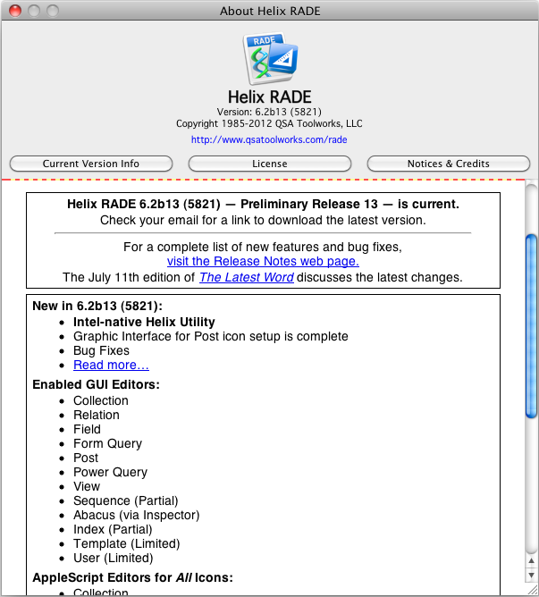 To those of you who renewed your monthly subscription to the Europa Pioneer Plan, a $20* charge will appear on your credit card today. (If you joined the monthly plan after June 10, 2012, the monthly charge is $40.) When we charge your card, we send an email containing a link to the latest update, so if you haven’t already gotten that email, please contact us right away. To those of you who renewed your annual subscription, look for an email an email containing a link to the latest update. You can also get it by logging in to our web store and checking your current licenses. If you haven’t received that email, perhaps you didn’t respond to our emails and calls asking you to renew for another year. If you didn’t renew or didn’t get the email, please contact us so we can investigate. For those out there who haven’t joined us yet, you can still join the monthly plan, for an initial payment of just $80.00, followed by monthly payments of $40.00. Or you can pay $440.00 and get every update we release until May 31, 2013. We’re still committed to monthly releases, so that’s 10 more updates delivered to you automatically. Installing EuropaThe installation process remains the same: mount the installer disk image, drag the new Helix RADE onto the Applications folder and let go. If you are updating from an earlier version of Europa, double click the Install Update icon and your Europa RADE will be seamlessly updated to the new version, even if you have a collection open! (You will be prompted to save changes before closing an open collection.) As always, the complete notes regarding what’s new in this release are found on the Preliminary Release 13 Release Notes page. To get the new Helix Utility, open the “Helix Diagnostics” folder in the disk image and drag Helix Utility (not ‘Helix Utility OS X’) into your applications folder, or wherever you have Helix RADE installed. One more note regarding updates: remember that your participation in the Europa Pioneer program entitles you to Interim Builds. As we work to deliver our “10th of the month” releases into your hands, we make each step along the way available for those who like to live on the ‘bleeding edge’ of Helix progress. Sometimes these releases bring dramatic improvements, but sometimes they contain bugs that require users to revert to the previous release. Sometimes — as was the case this last month — collections used with them are adversely affected and must be discarded. The Interim Builds are definitely and not for everybody, but if you don’t want to wait an entire month to see what we’re working on, check them out. And if you want to use them on a regular basis, contact Matt because he has a sensational little script that makes the process of downloading and installing the interim builds completely transparent. You may have missed the memoAs always, this edition of The Latest Word contains an overview of the progress we’ve made, but before we turn our attention to this month’s bounty, we need to make an appeal to those of you who haven’t yet renewed your subscription to the Europa Pioneer Plan. In the last edition of The Latest Word, we pointed out that Helx RADE 6.2b12 — the June 2012 release — was permanently enabled. If you decided to not stay in the Europa Pioneer Plan for another year, you had a product that would not expire, as all the previous monthly releases had. But if you do drop out, it also means that when the product is eventually released, you will have to pay something more to get the final version. The amount you’ve put in — however much it is — becomes your discount on the price of finished Helix RADE 6.2, whenever it arrives. A little more than half of the program participants from the first year renewed their membership right away. While it was a bit disappointing that everybody didn’t renew immediately, we were reasonably sure that the rest of you weren’t giving up. Either you “missed the memo,” so to speak, or your renewal request got “lost in the mail,” or maybe you just were so beat by the heat that you just hadn’t gotten around to renewing yet. So we started contacting the Pioneers who had not yet responded. Through that effort, we’ve managed to cut that half down to about a quarter, and almost everyone we actually spoke to indicated that they wanted to renew but just hadn’t gotten around to it yet, as we had hoped. One member indicated that budget cutbacks have forced him out of the program, but asked us to keep in touch with him when we’re finally done; another had actually passed away the day before we sent our first renewal request. (Please don’t let that happen to you!) But everyone else has given us their enthusiastic support and authorization to go ahead. All of this is to say that even if we haven’t spoken with you yet, there is still time to renew. If you were a member of Europa’s first year and haven’t heard from us, it’s probably because the contact information in our database is obsolete, or because your spam filter is shielding you from our entreaties. Either way, please contact us by phone or by email: we need you and we want you back. As for the rest of you, the ones who are still dug in and waiting for this to be over, this is the time to join up. The entry price is higher than it was when the program began, but take a look at how well Helix has served you in all these months and years since you last had to spend anything on it. Don’t wait, as many do, for your Classic-capable Mac to die and start scrambling to find a new one. We’ve been hard at work making sure that Helix will run on the latest Macs with the latest Mac OS. Your Helix collection can continue to serve you well into the future, but you’re only going to see that if you pitch in. Even if you’re happily tooling around macOS using the very reliable Helix Engine as your pilot, think about getting on board the Europa Pioneer Plan. Helix RADE 6