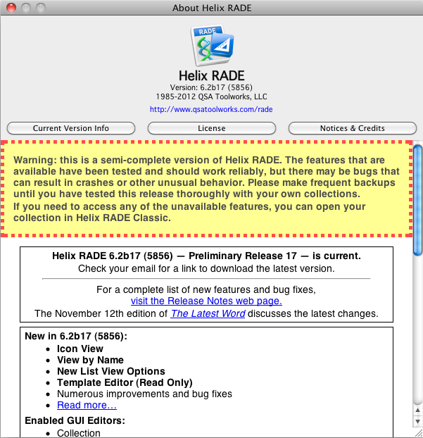 Despite the fact that our small corner of the world has been without power and, consequently, internet for more than two weeks now, the story of Helix goes on, must be told, and continues to get better and better the closer it gets to the end. With that introduction we bring you Helix RADE 6.2 Preliminary Release 17, which brings back, at long last, not one but two of the things that always made Helix so “Mac-like” in the first place. More about those wonderful things in a moment, but first: as with each month since the journey to Europa began, we are obliged to inform you of the cost of getting involved, which now means six more Preliminary Releases, more or less, before we are ready to “dispense with the preliminaries,” so to speak. But this time, having stared down the worst weather to hit our region in over 50 years — made all the worse by government incompetence — and itching and scratching from spending two weeks in the “dark ages,” we’re going to take a slightly different approach to Europa this month. We’re going to explain the cost of not getting involved. Those of you who are not members of the Europa Pioneer Plan will not be receiving an email today that contains a link to download the latest Helix RADE. You won’t be exploring the new features we’ve added. You won’t be familiarizing yourself with how Helix RADE works in macOS. You won’t be taking advantage of the savings you can still have if you don’t wait until the work is done. And you won’t be struck by moments of delight as you find yourself working productively in RADE in macOS at last. That being said, there is still time. You can still join the Europa Pioneer Plan and be welcomed with open arms. If you decide to sign up now, the price is still $440.00, which entitles you to every release through May 31, 2013. (Two years worth of progress!) If that’s too large a bite to take all at once, you can also make an initial payment of $240.00, followed by six more monthly payments of $40.00. Those of you who are members of the Europa Pioneer Plan should have that email already, containing the link to download the new release. The installation process remains the same. If you’re not familiar with the drill yet, you can review the instructions provided in last month’s edition of The Latest Word. And you can read the details about this month’s release on the Preliminary Release 17 Release Notes page. A look now, a touch laterA while back, we described the journey of getting all of Helix to macOS like this: stretch your arms left and right as far as you can and picture the distance from one fingertip to the same one on the other hand. It is a journey that has a definite beginning and end. The last time we used this analogy, we said we were on the palm of the other hand, way too late to turn back, or to give up. And now we are inching our way across the knuckles of the fingers of that hand. We told you most recently that we had three pieces left to complete and were working out the best order in which to get them all done. A short time back, realizing at last how close we were to finishing this thing, we promised ourselves that the template or the abacus would be functional by year’s end. We believed that between these two pieces of the puzzle lay perhaps the heart and soul of Helix, but the closer we got, the harder it was to decide which was which. In baseball, they say the tie goes to the runner. But even then it is clearly a subjective decision. In Helix, we decided that the tie goes to the one with the steepest AppleScript learning curve. Strictly speaking, the template wins, though the abacus is not far behind. But the abacus also has the Abacus Expression Language (AEL). And the overwhelmingly more apparent need, based strictly on anecdotal evidence, is that Helix users who no longer have easy recourse to Classic just need to be able to make some adjustments on their templates. Last month, we concluded by stating that it was our intention to have the template editor functional by year end, so clearly, we were already leaning heavily in that direction. We also hinted that it might come in stages. Preliminary Release 17 reveals the first stage: the read-only template. Although you can’t edit templates yet, you can now open them and view them in macOS RADE. There are a few issues left to be resolved in the display, and we’ve cataloged them in R7920 of techdb in case you want to add your own observations to the discussion, but this should give you a pretty good idea of what this new world looks like. Lest you be discouraged by this, please understand that this is a major step forward. Being able to display the template rectangles is the first step in being able to edit them, and with that (mostly) accomplished, we can go on to the next step. Dragging icons into a template provides an acid test for our new Element Panel but, like the abacus, it also draws attention (again) to the iconic nature of Helix… Project Cosmos: Icon View takes its first steps into macOSA casual reading of the brouhaha over Icon View would have you think that viewing a Helix collection or relation window as Icons or a List were simply two different ways of looking at the contents of a collection. That short-sighted analysis misses the point: not only are they different ways of looking at the objects in a collection, but they are also different ways of organizing the content of your applications. No single way of looking at that content is any more ‘correct’ than any other, and none are indispensable. The whole is, however, truly greater than the sum of its parts, and Icon View is what endeared many users to Helix in the first place. Once we had the Element Panel up and running, it was clear that what we had learned up to this point would simplify the process of bringing back Icon View. But Icon View had always seemed like a diversion, and in keeping with the principle of not doing anything that would delay