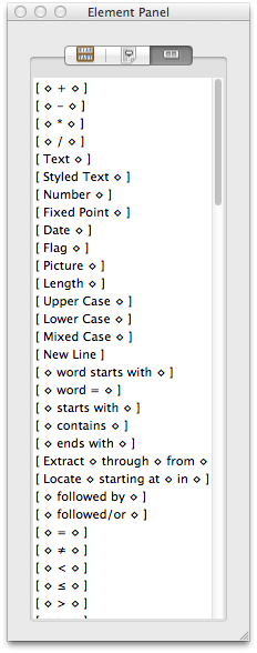 So they are clearly a place where things are put, or not put; a receptacle in the abacus circuitry. But ‘receptacle’ is a few too many syllables for such a commonly used word and so, after a bit more internal debate, we decided rename them sockets. And so, in the rest of this article, and in all future discussions of the abacus, these colorful boxes shall be referred to as ‘sockets.’ How many ways can you build an abacus?Each stage of the development process has brought us another way to construct an abacus. Early on there was the AppleScript method. Shortly thereafter there was the Abacus Expression Language. While most Helix users were seemingly unwilling to learn AppleScript, the Abacus Expression Language was embraced by many, and it was finally possible to quickly build a complete abacus from scratch. With at least one acceptable method of building an abacus in place, we turned our attention to other pressing concerns, leaving those of you who longed for the good old drag and drop abacus editor standing at the altar, so to speak. No more. Preliminary Release #21 of Helix RADE 6.2 restores abacus editing in full. At long last, you can click, drag, drop, type and select abacus components in the very-new-yet-very-familiar abacus editor window. The biggest thing that — in the minds of many users — has kept Helix 6.2 from being ‘real Helix’ is restored in glory. Now there are three ways to build an abacus: you can drag and drop tiles, arrows, and icons; you can write (or modify) an abacus using the Abacus Expression Language (AEL) and you can construct or edit an abacus using AppleScript. Regardless of your level of ‘geek-ness’ there’s now a method for you. But like everything else in Helix, the real power comes from combining the tools. None of these new methods requires that you use them exclusively; like any good team, each method has its particular strengths and the best work is done when they are used together. Now please don’t misunderstand: while we are very proud to have brought the graphical abacus editor back, we are also incredibly pleased with how the Abacus Expression Language has become a very solid and dependable ‘middle ground’ for editing abaci. Before the abacus editor window existed, you could use AEL to create or edit an abacus, but now that you can open the editor window, you can watch as changing the expression changes the tiles right before your eyes. Very cool. Very fun. Very Helix. Beyond producing a giddy experience, however, this new capability in Helix provides true time-saving power. For example, suppose you’ve created a complex abacus only to discover that in the middle of the tile chain you used a ◊ < ◊ when you meant to use a ◊ ≤ ◊ tile. What do you do? Of course, you could fix it the old way, dragging the ◊ < ◊ to the trash, dragging a ◊ ≤ ◊ out to replace it, and then re-hooking the arrows and re-adding the icons. But with the Abacus Expression Language, all you need to do is open the Inspector, highlight the ‘<’ in the abacus’s expression, type in the ‘≤’ character, and tab out. Arrows don’t come unhooked, icons aren’t removed along with the tile, and other objects that use this abacus do not ‘kick it out’ because it no longer represents a valid expression. If you don’t believe it really is that easy, we encourage you to try it for yourself. The tile repositoryIf you’ve been sitting on the sidelines waiting for Helix RADE to become more user-friendly, you are probably itching to drag out a tile and get back to work. But where do you drag one from? The answer is shown in the illustration at right. The Element Panel is the streamlined replacement for all those ‘slot machine’ lists that were attached to every editor in Classic RADE. When an abacus editor window is open, the Element Panel contains the tiles, fields and abaci that can be used to build an abacus expression. Right now the tiles don’t look very ‘tile-like’ — something we plan on rectifying in the future — but they work the same. In fact, when you click and start to drag, you’ll see the whole tile, attached to your pointer, as you drag it into place. And those textual representations of the tiles aren’t something we conjured up for just this purpose. No, they are the same as what you see in the Abacus Expression Language, and they match exactly the “AEL Syntax” shown in the AEL Syntax Technote we published to go along with the AEL Spec Page. So now that you can drag-and-drop tiles into the abacus editor window again, how do you add icons to those tiles? Just about any way you can imagine…