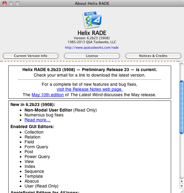 For those who haven’t joined us yet, the subscription plan has ended. But for a limited time, you can still pay $480.00 and get Helix RADE 6.2.x, which includes today’s Preliminary Release 23 as well as the final release, which will be delivered as soon as it is complete and ready for prime time, hopefully some time between now and June 10, 2013. At some point in the near future, we will be setting upgrade pricing, at which point the savings that are to be had by joining the Europa Pioneer Plan will be no more. Preliminary Release 23 provides the first look at the last piece of the Helix RADE for macOS puzzle: the User Editor. It also provides fixes for a nasty assortment of defects that have found their way into RADE during the development process. As always, you can find all the details of what has changed since the last Preliminary Release in the Preliminary Release 23 Release Notes. For now, let’s talk about Helix users for a moment, both as icons and people. The Helix User DichotomyAs noted above, today you get your first look at the new Helix RADE User Editor. Like the template and abacus editors — the two most recently added editors — the user editor has turned out to be a two-month project which takes us quite neatly to the end of the second year of the Europa Pioneer Program. This month, you can see that the user editor is still a work in progress, as we present it in ‘read-only’ form. To actually use it to create and modify user icons, you’ll have to wait until the next release. But the interface is present to the extent that you can clearly see where we are going with this totally revamped approach to editing users. As we have done with every other icon in RADE, the user editor works hand in hand with the Inspector and the Element Panel. Menus, commands, views, et. al. are dragged from the Element Panel (or from any other location) into the user’s ‘menubar’ window, and properties — such as command key equivalents and view permissions — are set in the Inspector. But in today’s release, the Element Panel is nothing but an empty window when a user editor is open, and all of the properties in the Inspector are disabled. That’s the nature of a ‘read only’ editor, but be patient, for the arrival of those functions heralds the end of Europa. (To see the Inspector, click the image on the right, then click the ‘Next’ button or press the right arrow key.) Even though there is little that you can actually do with it this month, we encourage you to open a familiar user in the editor see how it looks. Click on the menus and menu items to see how their properties will be configurable in the Inspector. We won’t get into any detailed discussion of the user editor here because, as we said, it is a work in progress. Instead, we thought this would be a good time to reflect more broadly upon the concept of the “user” in Helix. Because Helix gives you tools that let you distinguish between users of a Helix collection — among these, the user editor and the Username abacus tile — the informed collection designer can apply them to access the full power of the relational database at Helix’s core. We intend on exploring that power in the next edition of The Latest Word, but for today, let’s examine the other side of the ‘user’ coin: the person sitting in front of the computer, looking in. The question of relevance and the appeal of powerIn order for Helix to survive, it first had to be dragged, albeit kicking and screaming, into macOS and over to the Intel processor. But the painfully long conversion is nearly complete, and we are ready to start shifting our focus to what Helix needs to survive and thrive. In a word: Users. New users. Helix was never a mass-market product, like a game or a word processor. As a software development tool, its appeal was — and still is — to those brave enough to undertake the process of controlling the destiny of their own data, bending and shaping it to best serve their own informational needs. The original intent of the designers of Helix was to put as much power as possible into the hands of individuals who wanted to do this. Conversely, purveyors of off-the-shelf database applications prefer customers who do not want to do this. These companies have always wielded an outsized influence, portraying the do-it-yourselfer as a tilter at windmills. Why learn something you can use any way you like, their argument went, when it is so much easier to conform to someone else’s idea of how to manage your information? Programs that enable users the way Helix, FoxBase, 4D, Omnis and even FileMaker did were historically painted with a brush of impenetrability. Helix in particular was singled out by the Macintosh media as “iconoclastic,” as though being different than everything else available, as though bestowing power on mere end-users, were somehow bad things. When we undertook the process of bringing Helix to macOS, there was nothing quite like Helix available in macOS. Because the conversion process was going to take years, a big risk was rooted in the question of relevance: would Helix still be relevant when the job was done? The concepts behind Helix are now nearly thirty years old, but the idea of architecting and building data management structures with icons instead of hard code is still a very worthwhile and viable notion. There are many individuals — as well as new entrepreneurs and small business owners — for whom Helix would still provide a fresh new way of taking control of their data. Of course, today’s potential Helix customer may be just as likely to turn to a “cloud-based solution” for their data maintenance needs as to doing it themselves. But as each new breach of security ends up exposing sensitive customer data to identity thieves, the innovative way Helix couples the power of relational databases with the ability to control and safeguard the storage and distribution of data becomes ev